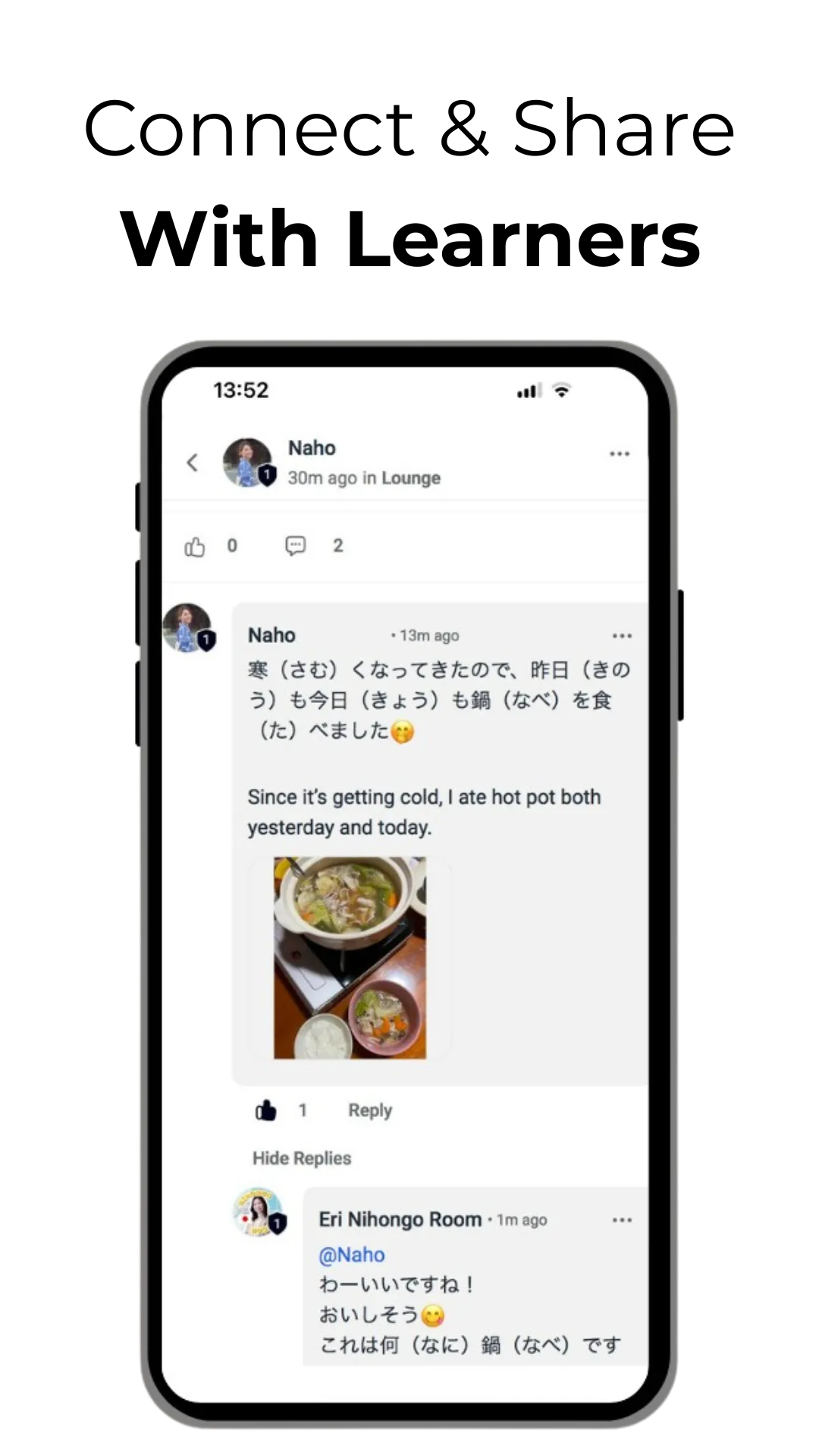 We alternate between Japanese and English, so you can get used to the sounds of Japanese, in the community, you can chat in both English and Japanese.